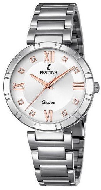 Zegarek damski F16936-B marki Festina to stylowe połączenie funkcjonalności oraz modnego designu. Model ten w gamie innych zegarków tego producenta występuje w serii Festina Mademoiselle. Atrakcyjną budowę zegarka osiągnięto dzięki tarczy w kolorze srebrnym. Zegarek ten prezentuje godzinę w formacie analogowym dzięki czemu odczyt jest bardzo łatwy. Koperta w odcieniach koloru srebrnego szeroka jest na 32.5 mm oraz ma grubość 8 mm - wyróżnia się okrągłym kształtem.