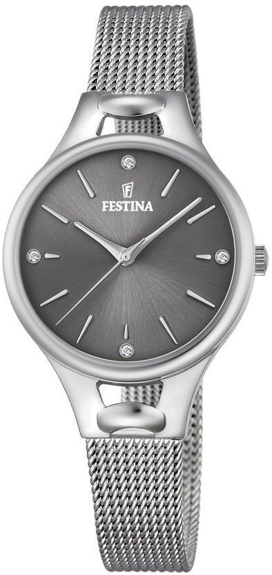 Damski zegarek F16950-D z kolekcji Festina Mademoiselle marki Festina to połączenie smaku i oryginalnych funkcji. Charakterystyczny wygląd czasomierza osiągnięto m.in. poprzez cyferblat w kolorze szarym. Zegarek ten prezentuje aktualny czas w formacie analogowym dzięki czemu odczyt jest bezproblemowy. Koperta w odcieniach koloru srebrnego szeroka jest na 32 mm oraz ma grubość 8 mm - w kształcie okrągłym.