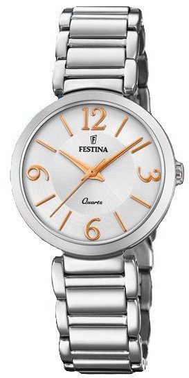 Damski zegarek F20212-1 z serii Festina Mademoiselle marki Festina to połączenie smaku oraz nowatorskich funkcji. Stylu nadaje wysokiej klasy tarcza w kolorze białym. Zaprezentowana metodą analogową aktualna godzina jest czytelna i łatwa do odczytania. Koperta została ozdobiona kolorem srebrnym szeroka jest na 30 mm oraz ma grubość 8 mm - w kształcie okrągłym.
