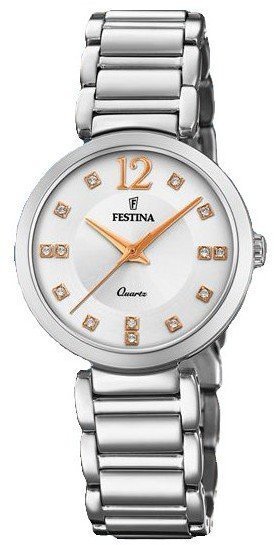 Model damski F20212-3 zalicza się do kolekcji Festina Mademoiselle marki Festina. Stylu nadaje wysokiej jakości cyferblat w kolorze białym. Zaprezentowana metodą analogową aktualna godzina jest czytelna i prosta do odczytania. Koperta została pokryta kolorem srebrnym szeroka jest na 30 mm oraz ma grubość 7 mm - posiada okrągły kształt.