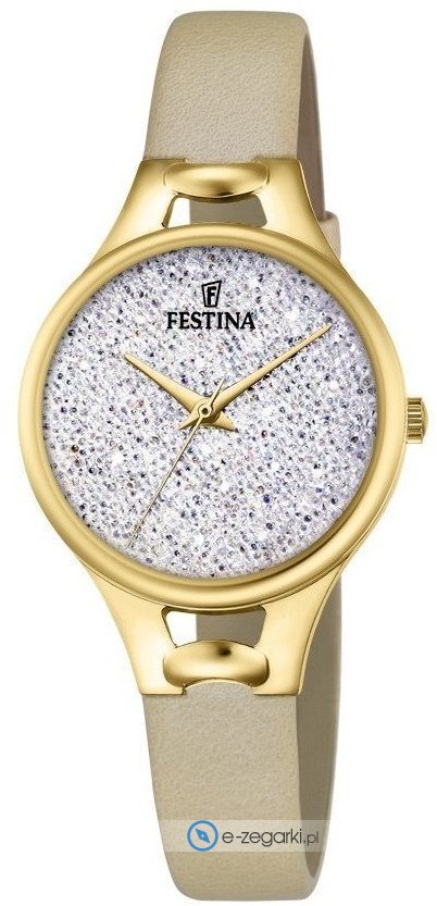 Zegarek damski F20335-1 marki Festina to dobre połączenie funkcjonalności a także ciekawego wzornictwa. Model ten zalicza się do serii Festina Mademoiselle. Tarcza zegarka jest w kolorze srebrnym. Zegarek ten pokazuje aktualny czas w formacie analogowym dzięki temu odczyt jest bezproblemowy. Koperta jest w kolorze złotym szeroka jest na 32 mm oraz ma grubość 9 mm - w kształcie okrągłym.