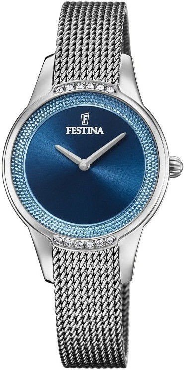 Zegarek damski F20494-2 marki Festina to dobre połączenie funkcjonalności oraz modnego designu. Model ten w gamie pozostałych zegarków tego producenta występuje w kolekcji Festina Swarovski. Cyferblat zegarka w kolorze granatowym. Aktualna godzina zaprezentowana jest w sposób analogowy co niezmiernie łatwo pozwala ją odczytać. Koperta jest w kolorze srebrnym szeroka jest na 30 mm - posiada okrągły kształt.