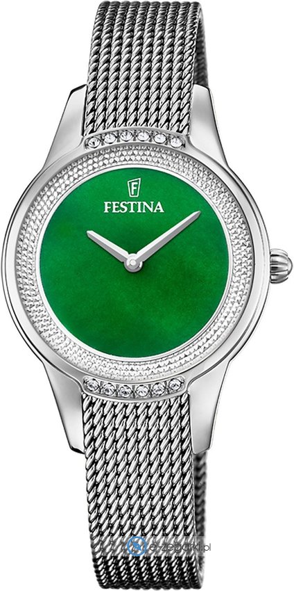 Zegarek damski F20494-7 marki Festina to stylowe połączenie funkcjonalności i modnego designu. Model ten jest z kolekcji Festina Mademoiselle. Nieschematyczny wygląd zegarka uzyskano m.in. poprzez tarczę w kolorze zielonym. Zegarek ten prezentuje godzinę w formacie analogowym dzięki czemu odczyt jest intuicyjny. Koperta jest w kolorze srebrnym szeroka jest na 30 mm oraz ma grubość 8 mm - ma okrągły kształt.