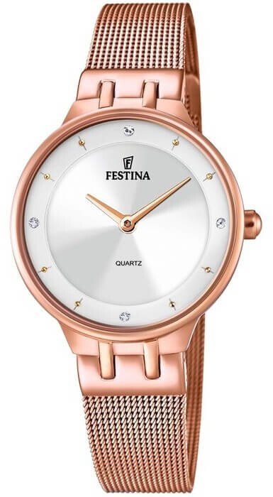 Damski zegarek F20599-1 z serii Festina Mademoiselle marki Festina to połączenie estetyki oraz nowatorskich funkcji. Stylu nadaje wysokiej jakości tarcza w kolorze srebrnym. Zaprezentowana metodą analogową aktualna godzina jest czytelna i szybka do odczytania. Koperta jest ozdobiona kolorem różowo złotym szeroka jest na 31 mm oraz ma grubość 8 mm - posiada okrągły kształt.