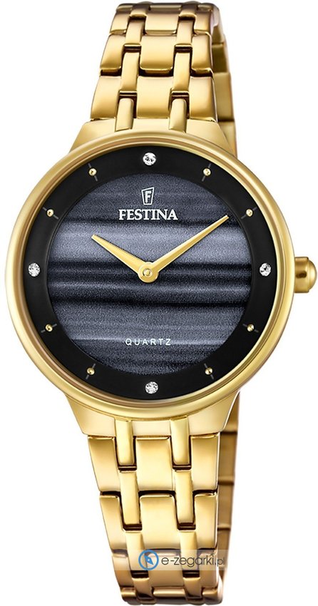 Zegarek damski F20601-D marki Festina to stylowe połączenie funkcjonalności oraz ciekawego designu. Model ten w gamie innych zegarków tego producenta występuje w kolekcji Festina Mademoiselle. Ciekawy wygląd czasomierza uzyskano m.in. poprzez tarczę w kolorze szarym. Godzina zaprezentowana jest w sposób analogowy co intuicyjnie pozwala ją odczytać. Koperta w barwach koloru złotego szeroka jest na 30 mm oraz ma grubość 8 mm - ma okrągły kształt.