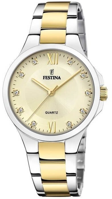 Zegarek damski F20618-1 marki Festina to idealne połączenie funkcjonalności i ciekawego designu. Wysokiej jakości cyferblat zegarka pokryto złotym kolorem. Godzina prezentowana jest w sposób analogowy co intuicyjnie pozwala ją odczytać. Koperta jest ozdobiona kolorem srebrnym szeroka jest na 34 mm oraz ma grubość 8 mm - wyróżnia się okrągłym kształtem.