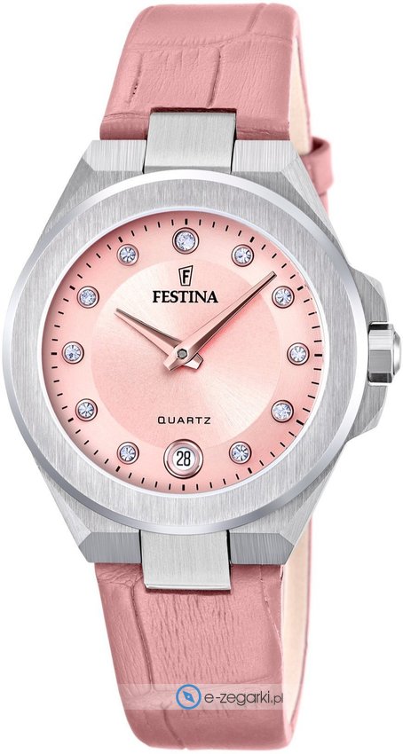 Zegarek damski F20701-2 marki Festina to stylowe połączenie funkcjonalności oraz ciekawego designu. Model ten w gamie pozostałych zegarków tego producenta występuje w serii Festina Mademoiselle. Wysokiej jakości cyferblat zegarka ozdobiono różowym kolorem. Pokazana metodą analogową bieżąca godzina jest czytelna i łatwa do sprawdzenia. Koperta jest pokryta kolorem srebrnym szeroka jest na 33 mm oraz ma grubość 8 mm - charakteryzuje się okrągłym kształtem.