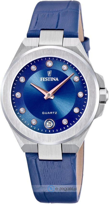 Zegarek damski F20701-4 marki Festina to idealne połączenie funkcjonalności a także modnego designu. Model ten w gamie pozostałych zegarków tego producenta występuje w kolekcji Festina Mademoiselle. Niestereotypowy wygląd zegarka uzyskano także dzięki tarczy w kolorze niebieskim. Godzina zaprezentowana jest w sposób analogowy co intuicyjnie pozwala ją odczytać. Koperta w odcieniach koloru srebrnego szeroka jest na 33 mm oraz ma grubość 8 mm - w kształcie okrągłym.
