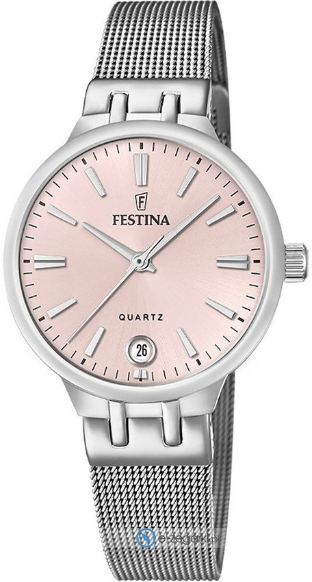 Damski zegarek F20712-3 z serii Festina Mademoiselle marki Festina to połączenie stylu i oryginalnych funkcji. Ciekawą stylistykę zegarka uzyskano z pomocą tarczy w kolorze różowym. Aktualna godzina zaprezentowana jest w sposób analogowy co niezmiernie łatwo pozwala ją odczytać. Koperta została pokryta kolorem srebrnym szeroka jest na 32 mm - cechuje się okrągłym kształtem.