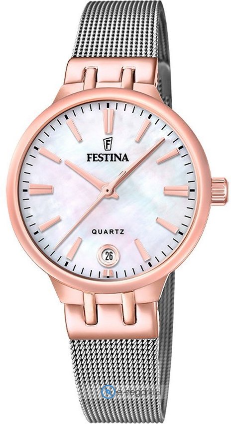 Zegarek damski F20715-1 marki Festina to stylowe połączenie funkcjonalności i modnego wzornictwa. Model ten w gamie pozostałych zegarków tego producenta występuje w serii Festina Mademoiselle. Cyferblat zegarka jest w kolorze perłowym. Zaprezentowana metodą analogową aktualna godzina jest czytelna i łatwa do sprawdzenia. Koperta w odcieniach koloru różowo złotego szeroka jest na 32 mm - posiada okrągły kształt.
