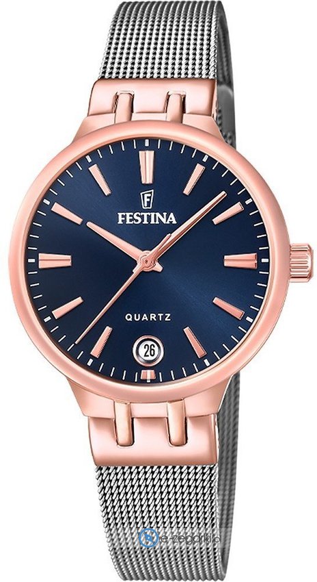 Zegarek damski F20715-3 marki Festina to idealne połączenie funkcjonalności oraz modnego designu. Model ten w gamie innych zegarków tego producenta występuje w serii Festina Mademoiselle. Ciekawą stylistykę zegarka osiągnięto dzięki tarczy w kolorze niebieskim. Godzina pokazywana jest w sposób analogowy co bez trudu pozwala ją odczytać. Koperta jest w kolorze różowo złotym szeroka jest na 32 mm - ma okrągły kształt.