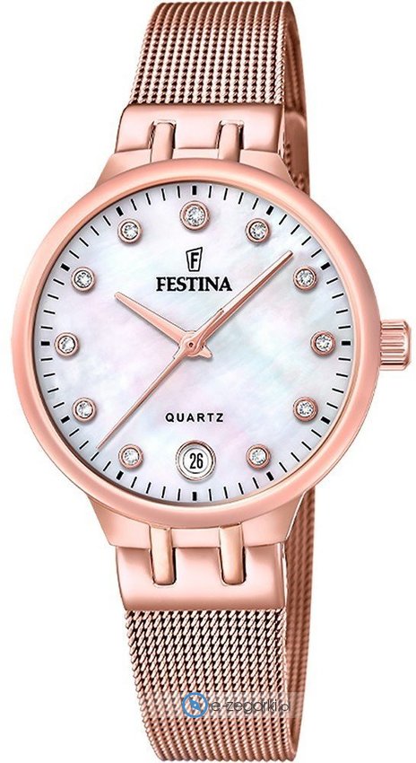 Festina F20716-1 - damski zegarek przeznaczony dla osób szukających zegarka z rodziny Festina Mademoiselle. Styl zapewnia wysokiej klasy cyferblat w kolorze perłowym. Godzina przedstawiona jest w sposób analogowy co intuicyjnie pozwala ją odczytać. Koperta jest w kolorze różowo złotym szeroka jest na 32 mm - posiada okrągły kształt.