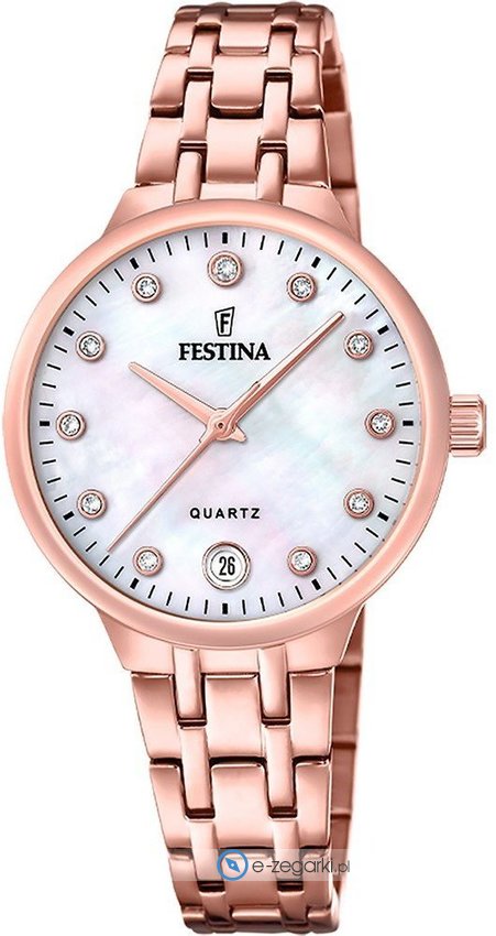 Zegarek damski F20722-1 należy do serii Festina Mademoiselle marki Festina. Charakteru nadaje wysokiej jakości tarcza w kolorze perłowym. Aktualna godzina przedstawiona jest w sposób analogowy co bez trudu pozwala ją odczytać. Koperta została pokryta kolorem różowo złotym szeroka jest na 32 mm - cechuje się okrągłym kształtem.