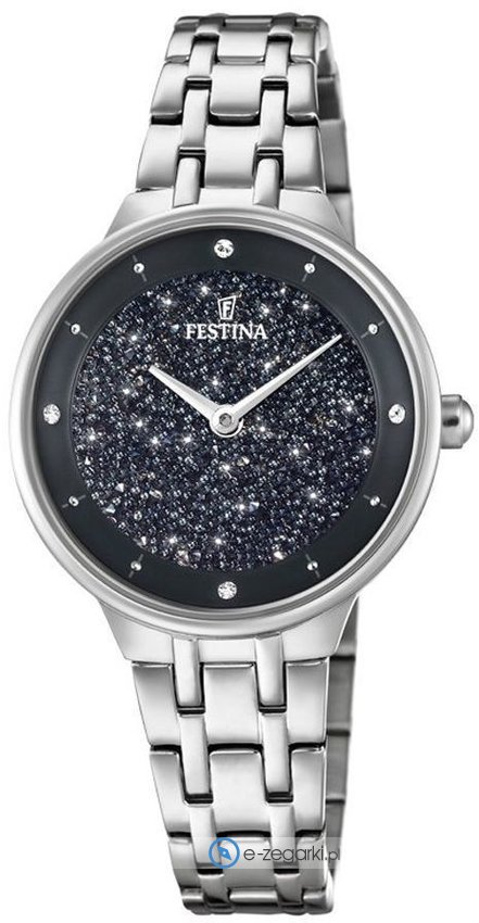 Zegarek F20382-3 marki Festina to gustowny zegarek naręczny damski, który posiada pomysłowe rozwiązania oraz funkcje. Model ten występuje w kolekcji Festina Swarovski. Ciekawy wygląd zegarka osiągnięto m.in. poprzez cyferblat w kolorze czarnym. Zegarek ten prezentuje aktualny czas w formacie analogowym dzięki temu odczyt jest bardzo łatwy. Koperta w odcieniach koloru srebrnego szeroka jest na 30 mm oraz ma grubość 8 mm - w kształcie okrągłym.