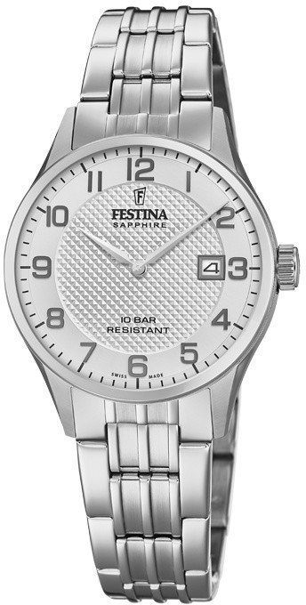 Festina F20006-1 - damski zegarek przeznaczony dla osób szukających zegarka z rodziny Festina Swiss Made. Charakter zapewnia wysokiej klasy tarcza w kolorze srebrnym. Pokazana metodą analogową aktualna godzina jest czytelna i prosta do sprawdzenia. Koperta jest ozdobiona kolorem srebrnym szeroka jest na 29 mm oraz ma grubość 9 mm - cechuje się okrągłym kształtem.