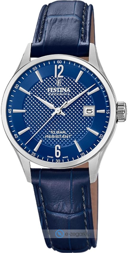Damski zegarek F20009-8 z kolekcji Festina Swiss Made marki Festina to połączenie smaku i oryginalnych funkcji. Charakter zapewnia wysokiej klasy cyferblat w kolorze niebieskim. Zaprezentowana metodą analogową aktualna godzina jest czytelna i łatwa do sprawdzenia. Koperta szeroka jest na 29 mm - w kształcie okrągłym.