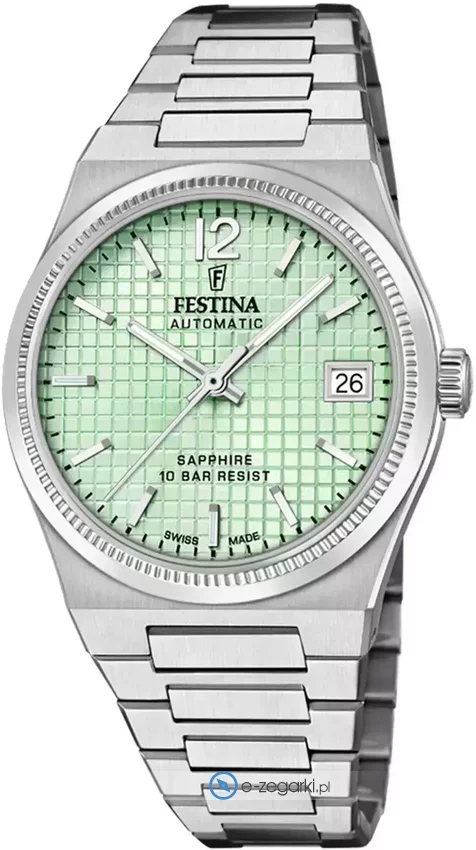 Zegarek F20029-3 marki Festina to elegancki zegarek naręczny damski, który wyposażono w ciekawe rozwiązania i funkcje. Model ten zalicza się do serii Festina Swiss Made. Stylu nadaje wysokiej klasy cyferblat w kolorze zielonym. Zaprezentowana metodą analogową bieżąca godzina jest czytelna i prosta do odczytania. Koperta w barwach koloru srebrnego szeroka jest na 35 mm oraz ma grubość 10 mm - posiada okrągły kształt.