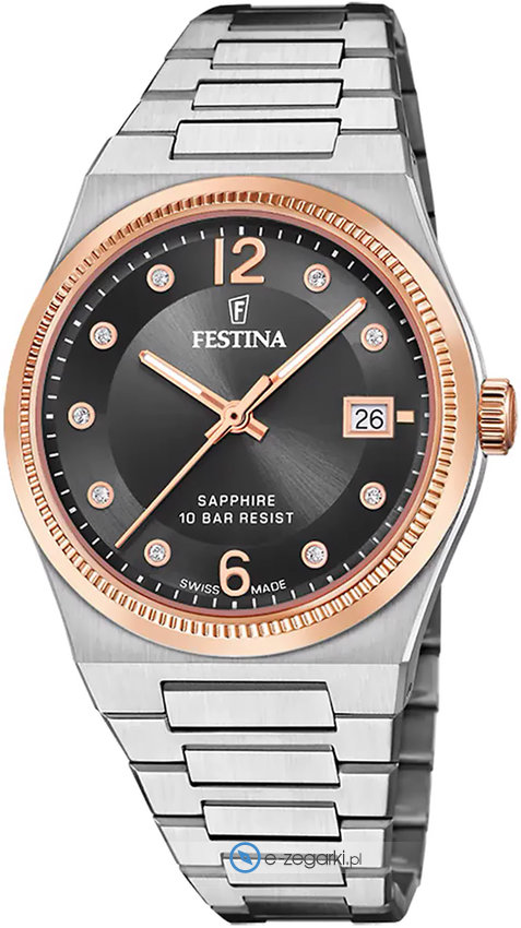 Zegarek damski F20037-3 marki Festina to idealne połączenie funkcjonalności oraz modnego designu. Model ten w gamie innych zegarków tego producenta występuje w kolekcji Festina Swiss Made. Niestereotypowy wygląd zegarka uzyskano również dzięki tarczy w kolorze czarnym. Zegarek ten pokazuje aktualny czas w formacie analogowym dzięki temu odczyt jest bezproblemowy. Koperta została ozdobiona kolorem różowo złotym szeroka jest na 35 mm oraz ma grubość 9 mm - w kształcie okrągłym.