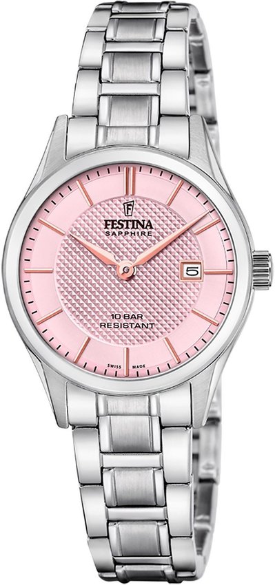 Zegarek damski F20068-3 marki Festina to dobre połączenie funkcjonalności oraz ciekawego designu. Model ten zalicza się do kolekcji Festina Swiss Made. Tarcza zegarka jest w kolorze różowym. Zaprezentowana metodą analogową aktualna godzina jest czytelna i prosta do odczytania. Koperta jest w kolorze srebrnym szeroka jest na 29 mm oraz ma grubość 9 mm - w kształcie okrągłym.
