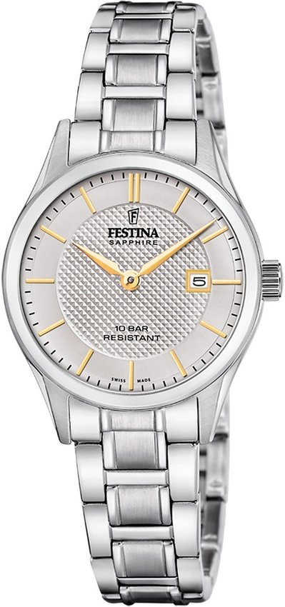 Zegarek damski F20068-4 marki Festina z serii Festina Swiss Made. Ciekawą budowę zegarka osiągnięto z pomocą tarczy w kolorze srebrnym. Zegarek ten prezentuje aktualny czas w formacie analogowym dzięki czemu odczyt jest intuicyjny. Koperta w barwach koloru srebrnego szeroka jest na 29 mm oraz ma grubość 9 mm - w kształcie okrągłym.