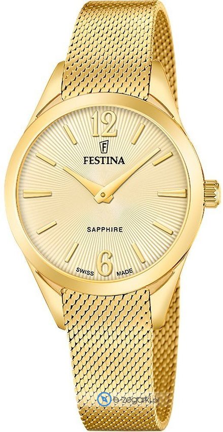 Zegarek damski F20077-3 marki Festina to idealne połączenie funkcjonalności a także modnego designu. Model ten w gamie innych zegarków tego producenta występuje w kolekcji Festina Swiss Made. Charakterystyczny wygląd zegarka uzyskano również dzięki tarczy w kolorze złotym. Godzina zaprezentowana jest w sposób analogowy co intuicyjnie pozwala ją odczytać. Koperta w barwach koloru złotego szeroka jest na 32 mm oraz ma grubość 7 mm - ma okrągły kształt.