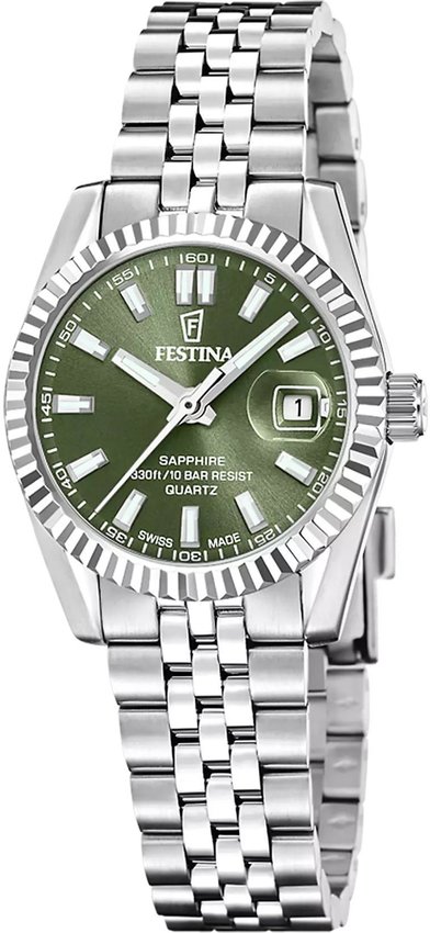 Zegarek damski F20087-5 marki Festina to idealne połączenie funkcjonalności a także modnego designu. Model ten należy do serii Festina Swiss Made. Stylu nadaje wysokiej klasy tarcza w kolorze zielonym. Zaprezentowana metodą analogową aktualna godzina jest czytelna i prosta do sprawdzenia. Koperta została pokryta kolorem srebrnym szeroka jest na 29 mm oraz ma grubość 9 mm - wyróżnia się okrągłym kształtem.