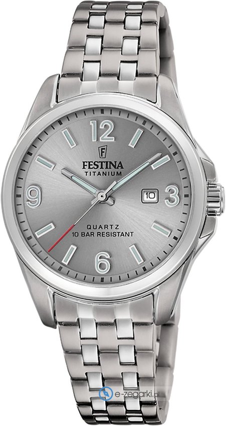 Model damski F20697-2 z rodziny Festina Titanium Date marki Festina. Charakter zapewnia wysokiej jakości cyferblat w kolorze szarym. Zaprezentowana metodą analogową aktualna godzina jest czytelna i szybka do sprawdzenia. Koperta jest ozdobiona kolorem szarym szeroka jest na 31 mm oraz ma grubość 9 mm - w kształcie okrągłym.