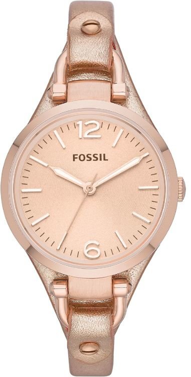 Model ES3413 marki Fossil to stylowy zegarek naręczny damski, który posiada ciekawe rozwiązania oraz funkcje. Stylu dodaje wysokiej jakości cyferblat w kolorze różowo złotym. Koperta szeroka jest na 32 mm oraz ma grubość 9 mm - cechuje się okrągłym kształtem.