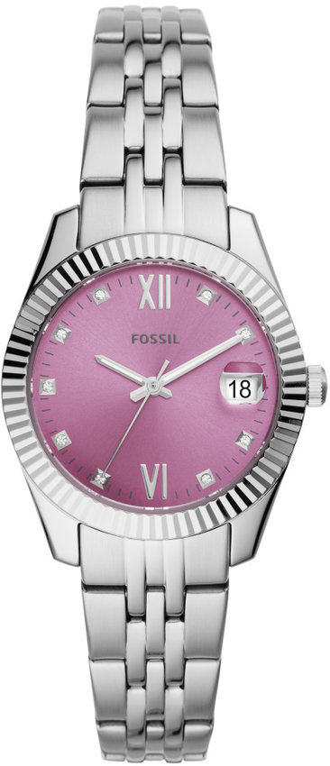 Zegarek damski ES4905 marki Fossil to ciekawa pozycja dla osób ceniących sobie dbałość o szczegóły jak również sprawne funkcjonowanie mechanizmów. Stylu nadaje wysokiej jakości cyferblat w kolorze różowym. Pokazana metodą analogową bieżąca godzina jest czytelna i szybka do odczytania. Koperta została ozdobiona kolorem srebrnym szeroka jest na 32 mm - ma okrągły kształt.
