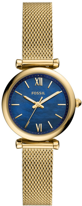 Zegarek damski ES5020 marki Fossil to dobre połączenie funkcjonalności oraz modnego wzornictwa. Stylu nadaje wysokiej jakości cyferblat w kolorze granatowym. Godzina prezentowana jest w sposób analogowy co intuicyjnie pozwala ją odczytać. Koperta jest w kolorze złotym szeroka jest na 28 mm - wyróżnia się okrągłym kształtem.