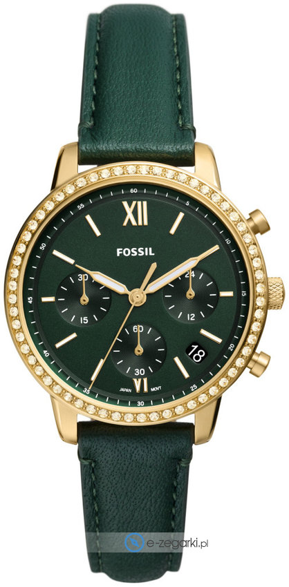 Model ES5239 marki Fossil to stylowy zegarek naręczny damski, który posiada pomysłowe rozwiązania i funkcje. Tarcza zegarka jest w kolorze zielonym. Pokazana metodą analogową aktualna godzina jest czytelna i łatwa do odczytania. Koperta jest w kolorze złotym szeroka jest na 36 mm - ma okrągły kształt.