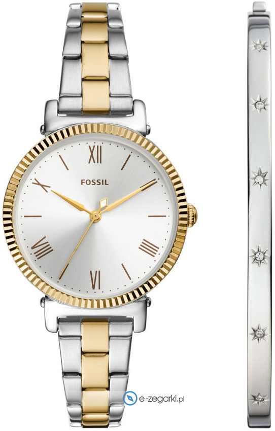 Model ES5249SET marki Fossil to stylowy zegarek naręczny damski, który posiada pomysłowe rozwiązania oraz funkcje. Aktualna godzina pokazywana jest w sposób analogowy co bez trudu pozwala ją odczytać.