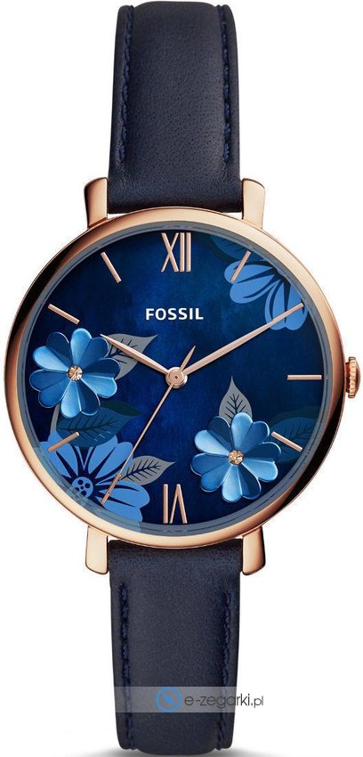 Zegarek damski ES4673 marki Fossil to dobre połączenie funkcjonalności oraz modnego designu. Model ten pochodzi z kolekcji Fossil Jacqueline. Styl zapewnia wysokiej klasy cyferblat w kolorze granatowym. Aktualna godzina zaprezentowana jest w sposób analogowy co niezmiernie łatwo pozwala ją odczytać. Koperta szeroka jest na 36 mm oraz ma grubość 8 mm - wyróżnia się okrągłym kształtem.