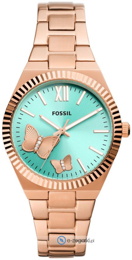 Damski zegarek ES5277 z kolekcji Fossil Scarlette marki Fossil to połączenie estetyki oraz ciekawych funkcji. Tarcza zegarka jest w kolorze niebieskim. Aktualna godzina prezentowana jest w sposób analogowy co niezmiernie łatwo pozwala ją odczytać. Koperta jest w kolorze różowo złotym szeroka jest na 38 mm - w kształcie okrągłym.