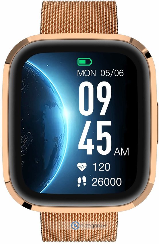 Zegarek damski 5904238484869 Smartwatch Garett GRC STYLE złoty stalowy marki Garett to ciekawa propozycja dla ludzi ceniących sobie dbałość o detale a także sprawne zachowanie mechanizmów. Pokazana metodą cyfrową aktualna godzina jest czytelna i prosta do sprawdzenia. Koperta jest w kolorze różowo złotym szeroka jest na 41 mm oraz ma grubość 13 mm - charakteryzuje się prostokątnym kształtem.