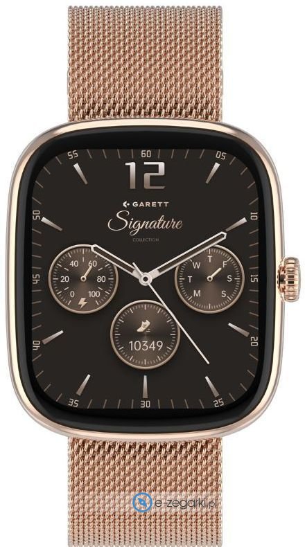 Damski zegarek Garett 5904238485040 Smartwatch Garett Flow rose gold mesh to esencja nowoczesnego podejścia do życia, zamknięta w eleganckiej formie. Ten smartwatch to połączenie technologii i modnego designu, idealne dla kobiety ceniącej sobie zarówno funkcjonalność, jak i estetykę. Aktualna godzina, prezentowana w sposób cyfrowy, to tylko jedna z wielu zalet tego modelu. Koperta w kolorze różowego złota, o szerokości 36 mm i grubości 8 mm, doskonale układa się na nadgarstku, dodając subtelnej elegancji każdej stylizacji. Ten zegarek, dzięki swoim funkcjom smart, staje się niezastąpionym towarzyszem każdego dnia. Smartwatch Garett Flow rose gold mesh to idealny wybór dla pań, które chcą być na bieżąco z najnowszymi technologiami, nie rezygnując przy tym z klasycznego i kobiecego wyglądu. Smartwatch Garett Flow rose gold mesh wyposażony w mechanizm zasilany akumulatorkiem, doładowywanym w momencie gdy sytuacja tego wymaga.