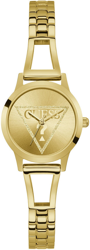 Model GW0002L2 marki Guess to elegancki zegarek naręczny damski, który posiada ciekawe rozwiązania oraz funkcje. Wysokiej trwałości cyferblat zegarka pokryto złotym kolorem. Zegarek ten pokazuje aktualny czas w formacie analogowym dzięki temu odczyt jest intuicyjny. Koperta została pokryta kolorem złotym szeroka jest na 27 mm - w kształcie okrągłym.