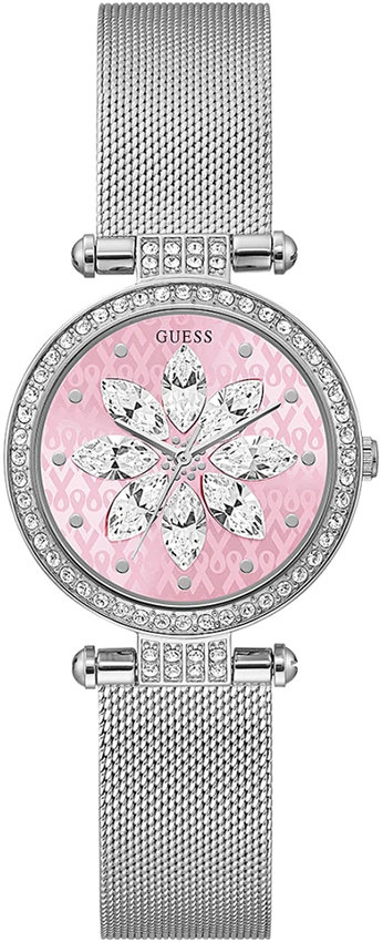 Zegarek damski GW0032L3 marki Guess to idealne połączenie funkcjonalności oraz ciekawego designu. Atrakcyjną stylistykę zegarka uzyskano dzięki tarczy w kolorze różowym. Zaprezentowana metodą analogową aktualna godzina jest czytelna i szybka do sprawdzenia. Koperta została pokryta kolorem srebrnym szeroka jest na 32 mm - charakteryzuje się okrągłym kształtem.