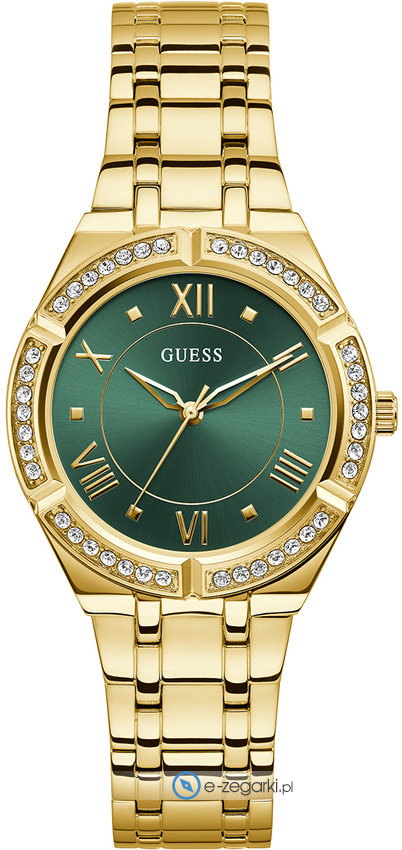 Zegarek damski GW0033L8 marki Guess to stylowe połączenie funkcjonalności a także ciekawego wzornictwa. Charakterystyczną konstrukcję czasomierza uzyskano dzięki tarczy w kolorze zielonym. Zegarek ten prezentuje godzinę w formacie analogowym dzięki temu odczyt jest bardzo łatwy. Koperta jest ozdobiona kolorem złotym szeroka jest na 36 mm oraz ma grubość 9 mm - ma okrągły kształt.