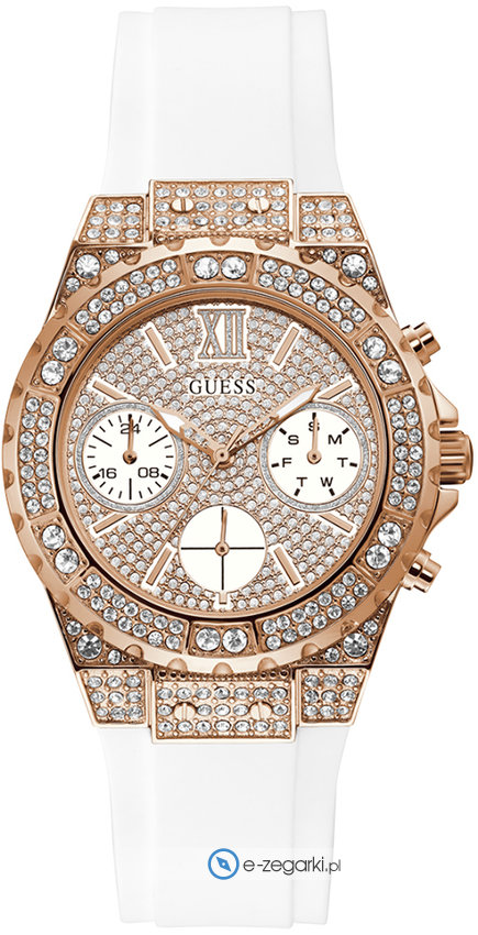 Zegarek damski GW0038L2 marki Guess to stylowe połączenie funkcjonalności i modnego designu. Cyferblat zegarka w kolorze różowo złotym. Pokazana metodą analogową aktualna godzina jest czytelna i szybka do odczytania. Koperta szeroka jest na 39 mm oraz ma grubość 11.5 mm - cechuje się okrągłym kształtem.