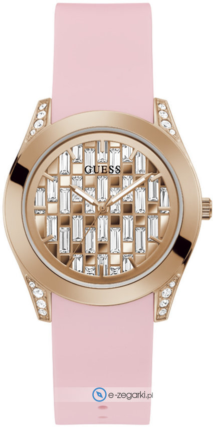 Model GW0109L2 marki Guess to stylowy zegarek naręczny damski, który posiada pomysłowe rozwiązania oraz funkcje. Atrakcyjny wygląd czasomierza osiągnięto również dzięki tarczy w kolorze różowo złotym. Aktualna godzina przedstawiona jest w sposób analogowy co intuicyjnie pozwala ją odczytać. Koperta jest pokryta kolorem różowo złotym szeroka jest na 39 mm oraz ma grubość 10.3 mm - wyróżnia się okrągłym kształtem.