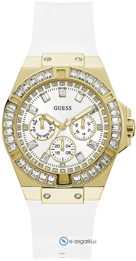 Model GW0118L5 marki Guess to gustowny zegarek naręczny damski, który posiada ciekawe rozwiązania oraz funkcje. Charakterystyczną budowę zegarka osiągnięto dzięki tarczy w kolorze srebrnym. Zegarek ten prezentuje godzinę w formacie analogowym dzięki czemu odczyt jest bezproblemowy. Koperta w odcieniach koloru złotego szeroka jest na 39 mm oraz ma grubość 10 mm - w kształcie okrągłym.
