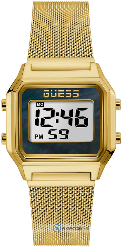 Zegarek damski GW0343L2 marki Guess to stylowe połączenie funkcjonalności i ciekawego wzornictwa. Aktualna godzina prezentowana jest w sposób cyfrowy co bez trudu pozwala ją odczytać. Koperta została ozdobiona kolorem złotym szeroka jest na 39 mm oraz ma grubość 13 mm.