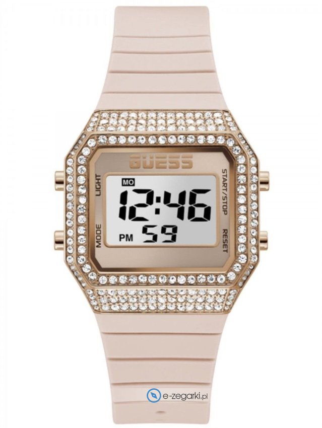 Zegarek damski GW0430L3 marki Guess to ciekawa propozycja dla ludzi ceniących sobie dbałość o detale a także bezproblemowe funkcjonowanie mechanizmów. Ciekawą budowę czasomierza uzyskano z pomocą tarczy w kolorze szarym. Pokazana metodą cyfrową bieżąca godzina jest czytelna i łatwa do sprawdzenia. Koperta jest pokryta kolorem różowo złotym szeroka jest na 39 mm - w kształcie prostokątnym.