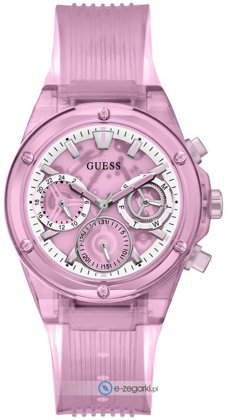 Model GW0438L2 marki Guess to gustowny zegarek naręczny damski, który wyposażono w ciekawe rozwiązania oraz funkcje. Ciekawy wygląd czasomierza uzyskano m.in. poprzez tarczę w kolorze różowym. Godzina prezentowana jest w sposób analogowy co bez trudu pozwala ją odczytać. Koperta jest w kolorze różowym szeroka jest na 39 mm oraz ma grubość 10 mm - cechuje się okrągłym kształtem.