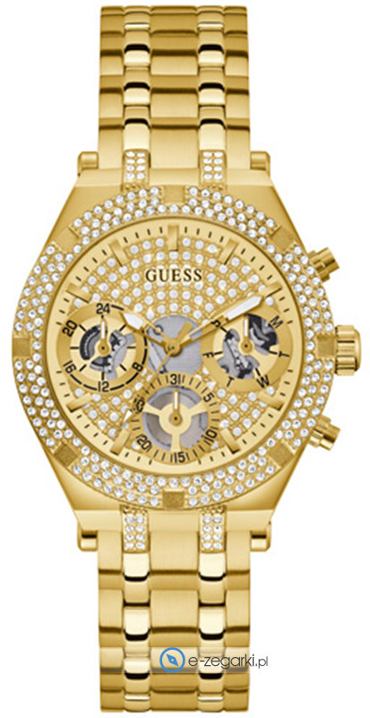 Damski zegarek Guess GW0440L2 to zegarek, który dzięki swemu wzornictwu zawsze będzie prezentował się dobrze. Charakterystyczny wygląd czasomierza osiągnięto m.in. poprzez cyferblat w kolorze złotym. Godzina prezentowana jest w sposób analogowy co intuicyjnie pozwala ją odczytać. Koperta jest w kolorze złotym szeroka jest na 38 mm oraz ma grubość 10 mm - w kształcie okrągłym.