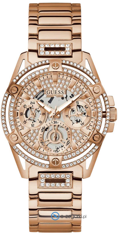 Model GW0464L3 marki Guess to gustowny zegarek naręczny damski, który posiada ciekawe rozwiązania oraz funkcje. Ciekawy wygląd czasomierza uzyskano także dzięki tarczy w kolorze różowo złotym. Zegarek ten pokazuje aktualny czas w formacie analogowym dzięki czemu odczyt jest bezproblemowy. Koperta jest ozdobiona kolorem różowo złotym szeroka jest na 40 mm oraz ma grubość 12 mm - wyróżnia się okrągłym kształtem.