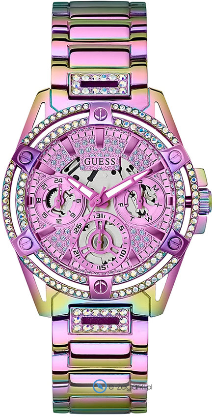 Zegarek damski GW0464L4 marki Guess to ciekawa propozycja dla ludzi ceniących sobie dbałość o szczegóły jak również bezproblemowe działanie mechanizmów. Niestereotypowy wygląd zegarka osiągnięto również dzięki tarczy w kolorze fioletowym. Godzina przedstawiona jest w sposób analogowy co niezmiernie łatwo pozwala ją odczytać. Koperta szeroka jest na 40 mm oraz ma grubość 12 mm - w kształcie okrągłym.