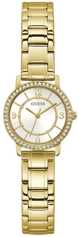 Model GW0468L2 marki Guess to stylowy zegarek naręczny damski, który wyposażono w ciekawe rozwiązania i funkcje. Nieschematyczny wygląd zegarka uzyskano m.in. poprzez cyferblat w kolorze srebrnym. Zegarek ten pokazuje godzinę w formacie analogowym dzięki temu odczyt jest bardzo łatwy. Koperta w barwach koloru złotego szeroka jest na 28 mm oraz ma grubość 8 mm - w kształcie okrągłym.