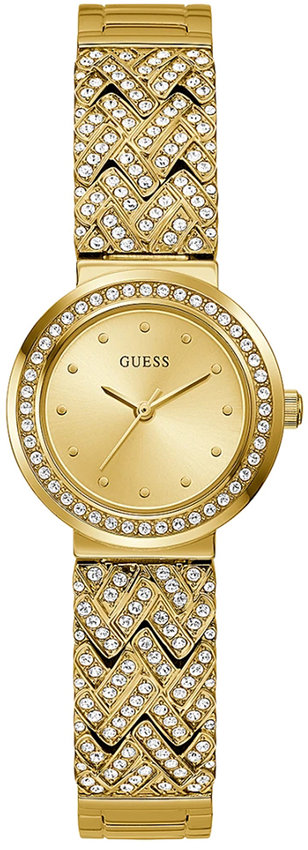 Model GW0476L2 marki Guess to elegancki zegarek naręczny damski, który wyposażono w ciekawe rozwiązania oraz funkcje. Charakterystyczny wygląd czasomierza uzyskano m.in. poprzez cyferblat w kolorze złotym. Zaprezentowana metodą analogową bieżąca godzina jest czytelna i szybka do odczytania. Koperta jest w kolorze złotym szeroka jest na 28 mm - posiada okrągły kształt.